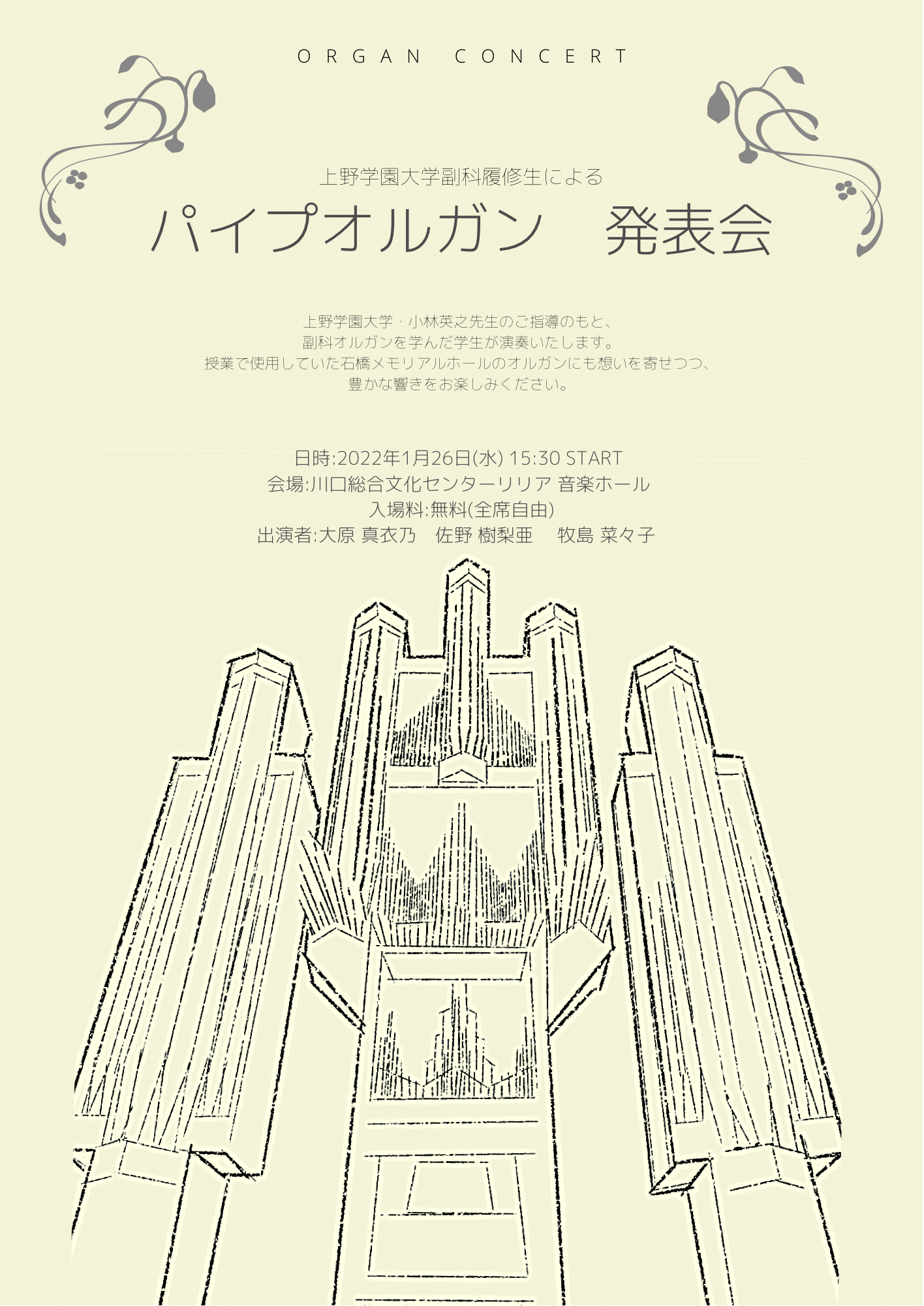 | 1/26(水) 15:30 | オルガン発表会![]() | 川口総合文化センターリリア | バッハ:コラールBWV601, シャイデマン:主キリスト、神のひとり子 | 無料 | |