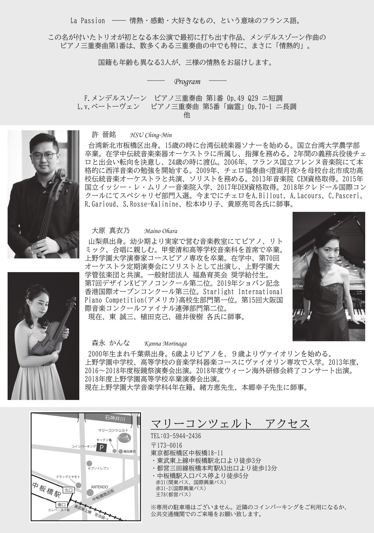 | 7/23(土) 14:00開演 | Trio La Passion Concert ![]() ![]() | マリーコンツェルト | F.メンデルスゾーン:ピアノ三重奏曲第1番Op.49, L.v.ベートヴェン:ピアノ三重奏曲第5番「幽霊」Op.70-1 他 | 一般:3,000円 学生:1,500円 アーカイブ配信 視聴:1,000円 | Chez Amis音楽教室 Tel:03-6356-8873 Email:chezamis.tokyo@gmail.com |