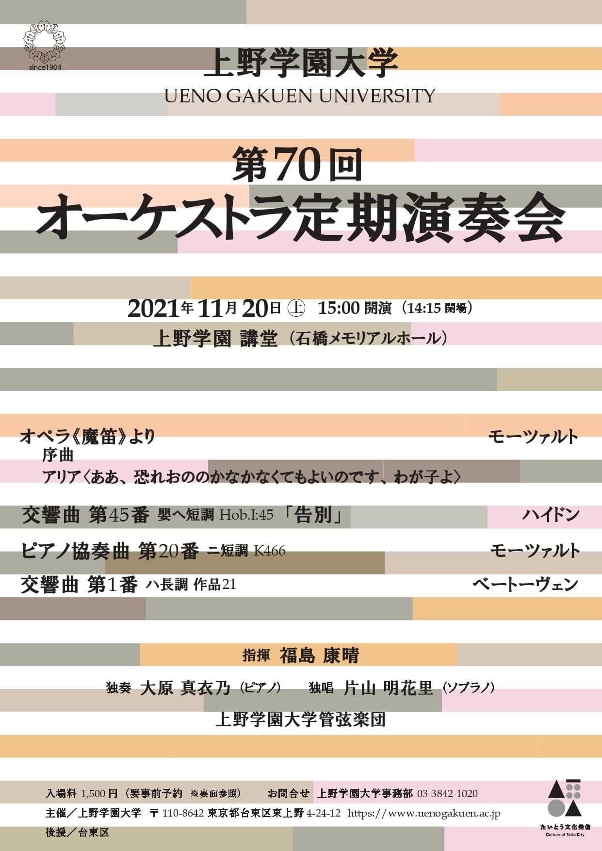 | 11/20(土) 15:00 | 上野学園大学オーケストラ定期演奏会![]() ![]() | 石橋メモリアルホール | モーツァルト:ピアノ協奏曲20番(ソリスト) | 1,500円(要予約・当日券なし) 販売終了 | 上野学園大学 予約先:0338421020(大学事務部)またはuenogakuen.concert@gmail.com メールの場合は次の内容をご記入ください。 【件名】申し込み:第70回オーケストラ定期演奏会 【氏名】 【電話番号】 |