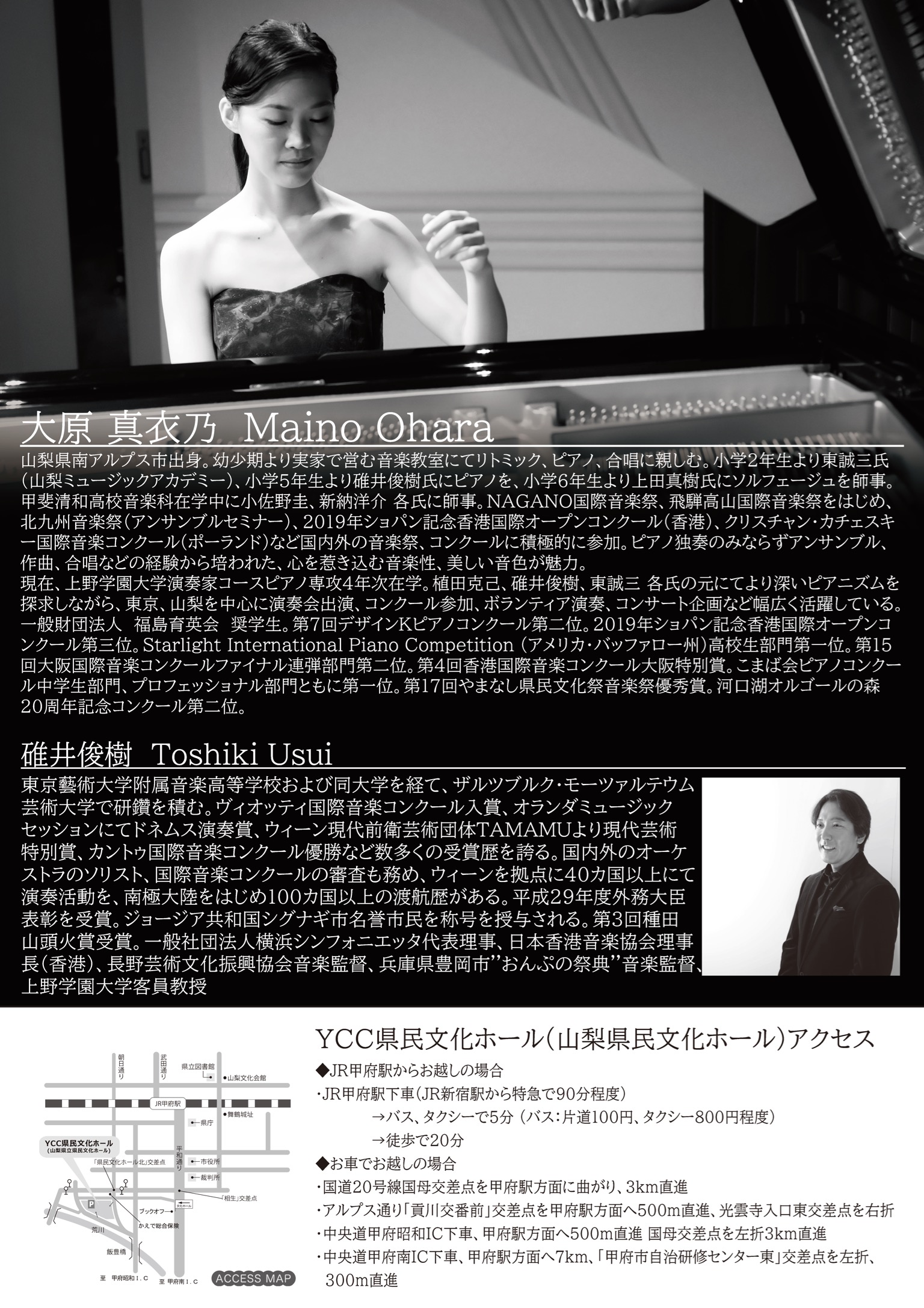| 4/2(金) 19:00 | 大原真衣乃ピアノリサイタル![]() ![]() | YCC県民文化ホール(山梨県民文化ホール) | シューベルト:即興曲op.90,ベートーヴェン:ピアノソナタ第17番op.31-2 “テンペスト”,リスト:「伝説」第1曲,第2曲他 | 一般:2,500円 学生:1,000円 | チケットお申込:<https://www.confetti-web.com/detail.php?tid=60496&>,または mainoohara.info@gmail.com へお問合せください 公演に関するお問合せ:e-mail:mainoohara.info@gmail.com FAX:055(282)3634 |