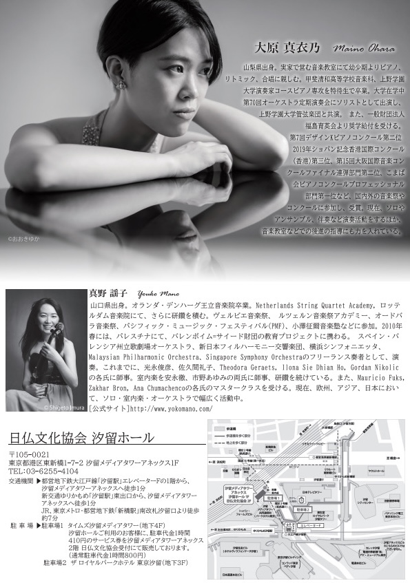 | 2/26(日) 開演19:00 | 大原真衣乃&椎名晴香 ピアノデュオコンサート![]() | スタジオ ヴィルトゥオージ(東京都百人町) | サン=サーンス:死の舞踏 OP.40 シューベルト:幻想曲 D940 OP.103 他 | 一般3,000円 学生1,000円 | お申込:Googleフォーム お問合せ:mainoohara@gmail.com |