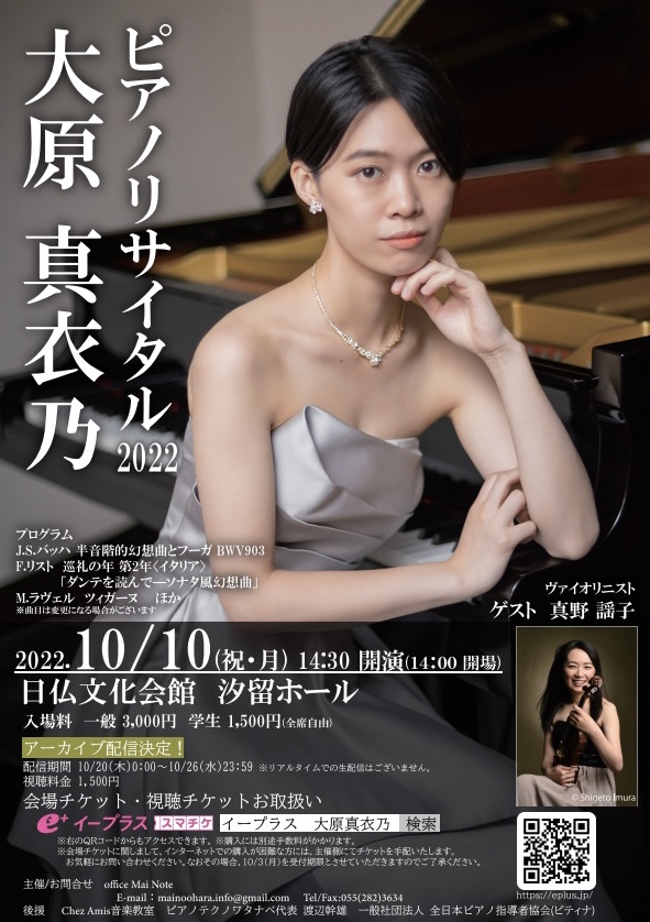 | 10/20(木) 0:00~ 10/26(水) 23:59 | 大原真衣乃 ピアノリサイタル2022 【アーカイブ配信】 | Streaming+ | J.S.バッハ:半音階的幻想曲とフーガBWV903, F.リスト:巡礼の年第2年〈イタリア〉より「ダンテを読んで」 他 ゲスト:Vn.真野謡子 | アーカイブ配信 視聴:1,500円 | 配信チケット取扱い: イープラス |