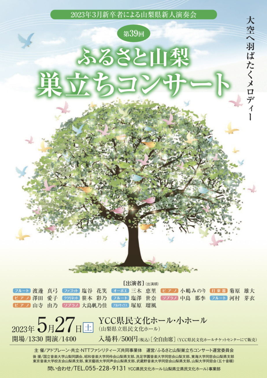 | 5/27(土) 開演14:00 | 山梨巣立ちちコンサート![]() | YCC県民文化ホール(山梨県民文化ホール)小ホール | タファネル:「魔弾の射手」によるファンタジー(伴奏) | 500円 | YCC県民文化ホール |