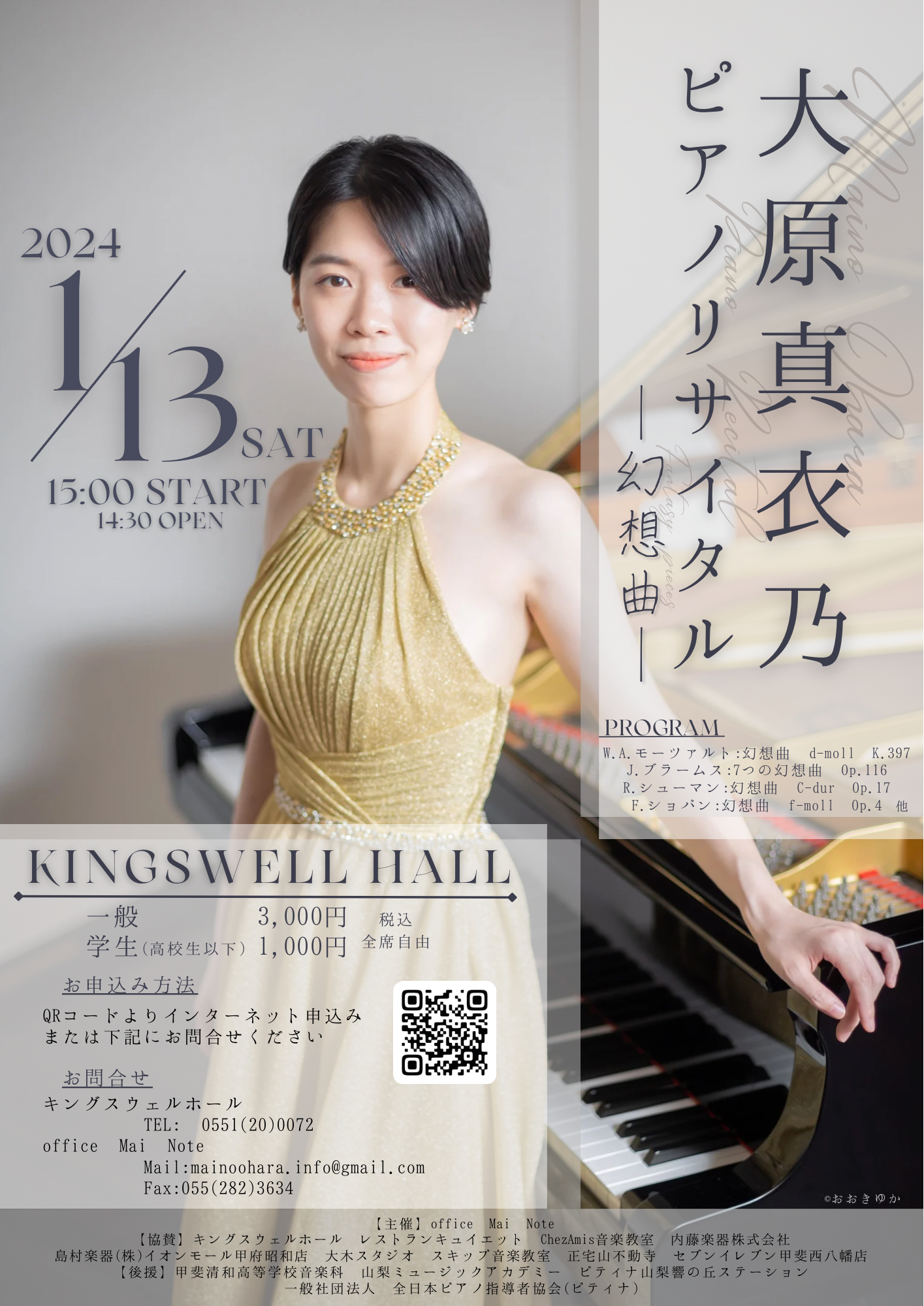 | 1/13(土) 開場14:30 開演15:00 | 大原真衣乃ピアノリサイタル2024![]() ![]() | キングスウェルホール | モーツァルト:幻想曲ニ短調、シューマン:幻想曲、ショパン:幻想曲 他 | 一般3,000円 学生 1,000円 | お申し込みフォーム |