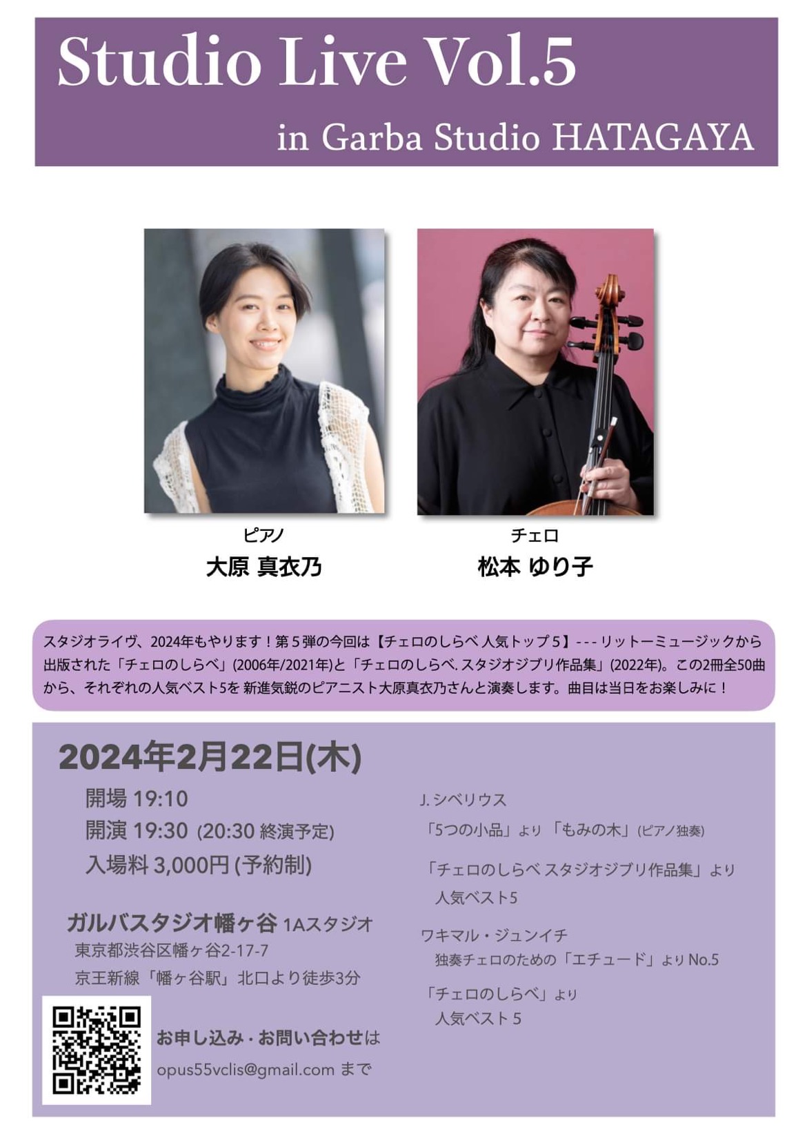 | 2/22(木) 19:10開場 19:30開演 | 松本ゆり子 Studio Live vol.5 ![]() | ガルバスタジオ幡ヶ谷 | チェロのしらべスタジオジブリ作品集、チェロのしらべより人気曲 | 3,000円(要予約) | お申込みフォーム |