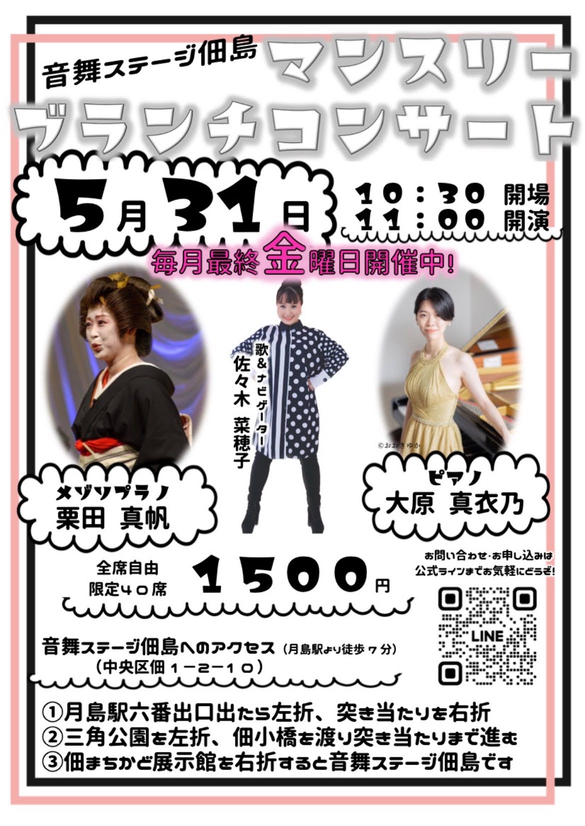 | 5/31(金) | マンスリーブランチコンサート![]() | 音舞ステージ佃島 | 1500円 | ||