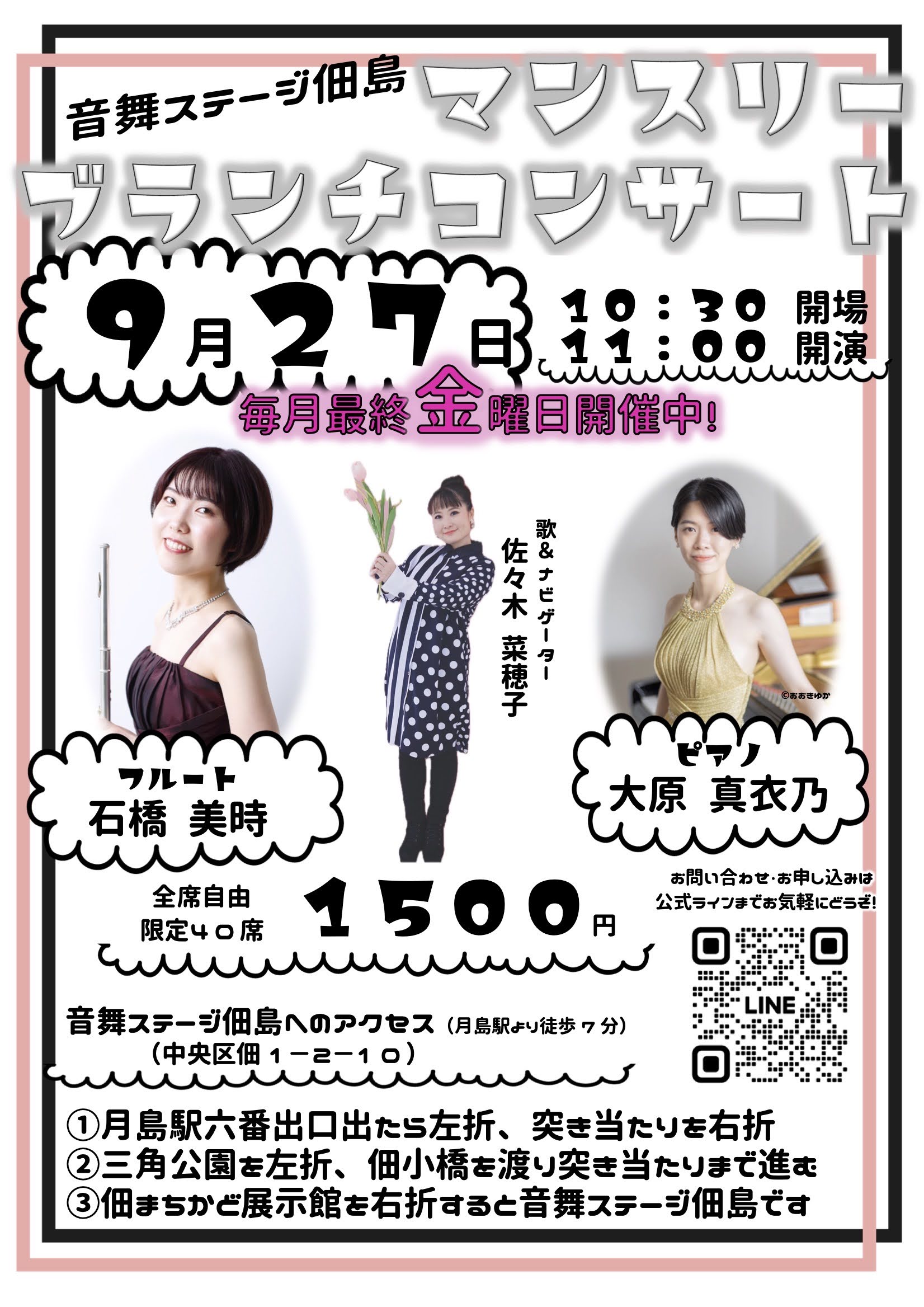 | 9/27(金) | マンスリーブランチコンサート![]() | 音舞ステージ佃島 | 1500円 | ||